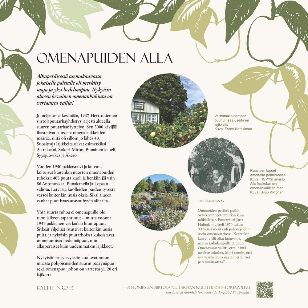 - Alkuperäisessä asemakaavassa jokaiselle palstalle oli merkitty maja ja yksi hedelmäpuu. Nykyisin alueen keväinen omenankukinta on...