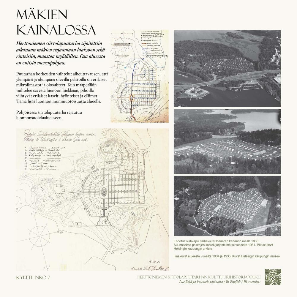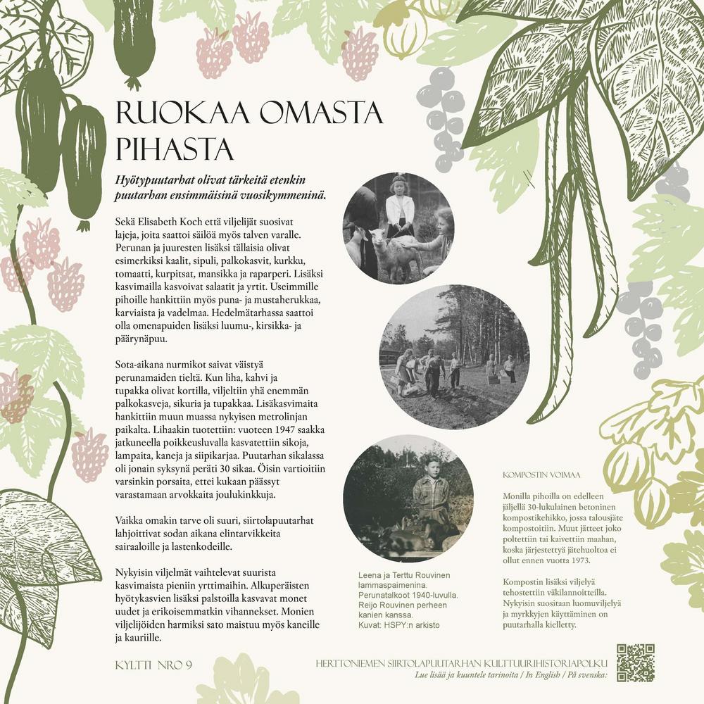 Kylteistä koostuva ‘kulttuurihistoriapolku’ kertoo alueen historiasta, rakennuksista ja alkuperäisistä puutarhasuunnitelmista sekä mökkiläisten arjen ja juhlien vietosta vuosikymmenten varrella.